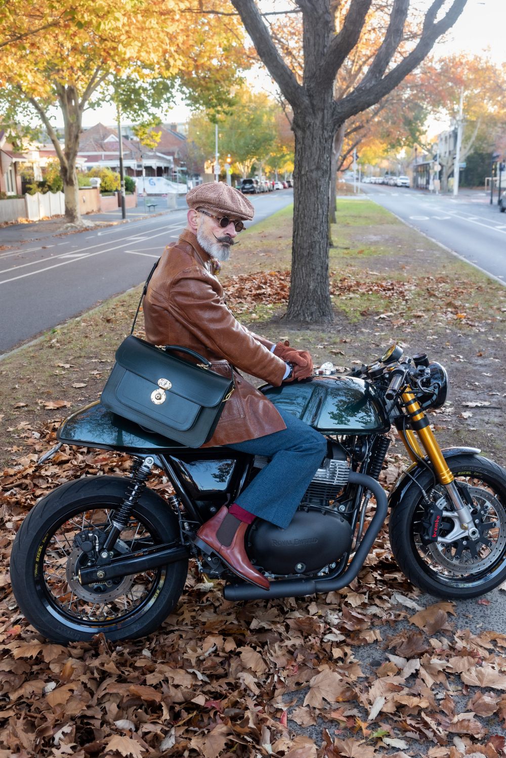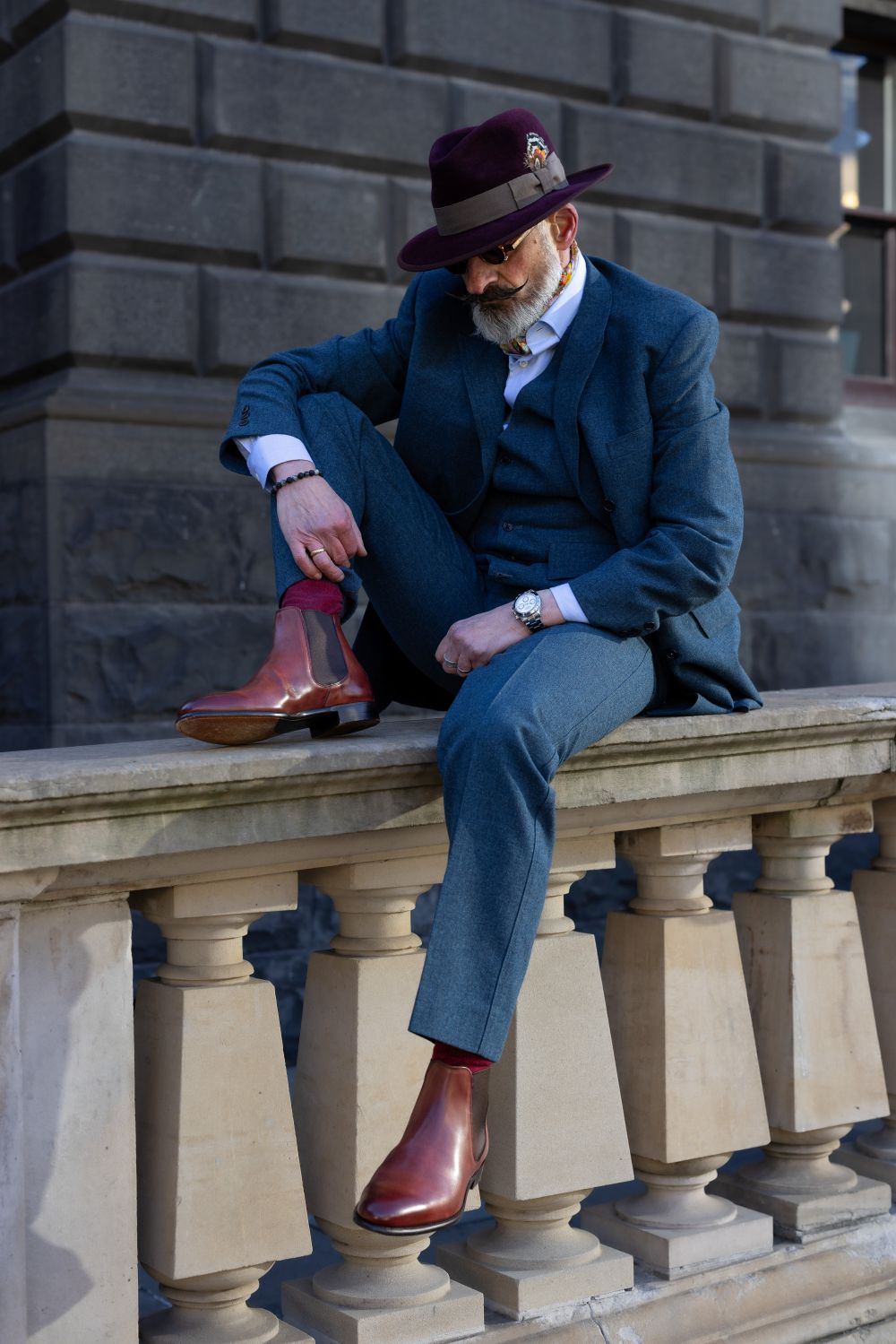 Jerry is a dapper gent for sure. He likes a suit, and he likes a hat…and he wears them well. He paired his suit with our Wilson Chelsea boot in dark leaf (below). British made, this is a very fine boot with a beautiful calf leather upper. While Jerry sports the Wilson with his suit, this style will look good with jeans too – and a motorbike – so is a core staple for any man’s wardrobe.