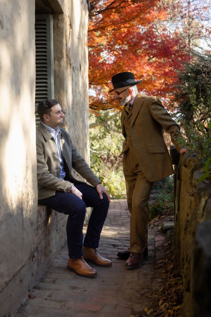 Jerry & Son also took a few styles out for a test drive in a more rural setting. Of course, Jerry had plenty of outfits to befit the occasion and teamed a checked suit with our burgundy grain Windermere laced boot. With a leather upper and full leather lining, the commando rubber sole and Veldtschoen construction make this a highly water-resistant shoe and most excellent for scuffing through autumn leaves.