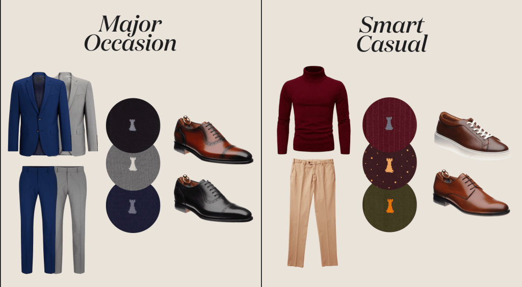 Start with the context. Formal? Go for black, navy, or grey, perfect with Oxfords and suits. Smart casual? Experiment with bolder shades (olive green, burgundy) or subtle patterns, pairing them with Derby shoes or brogues or smart sneakers.